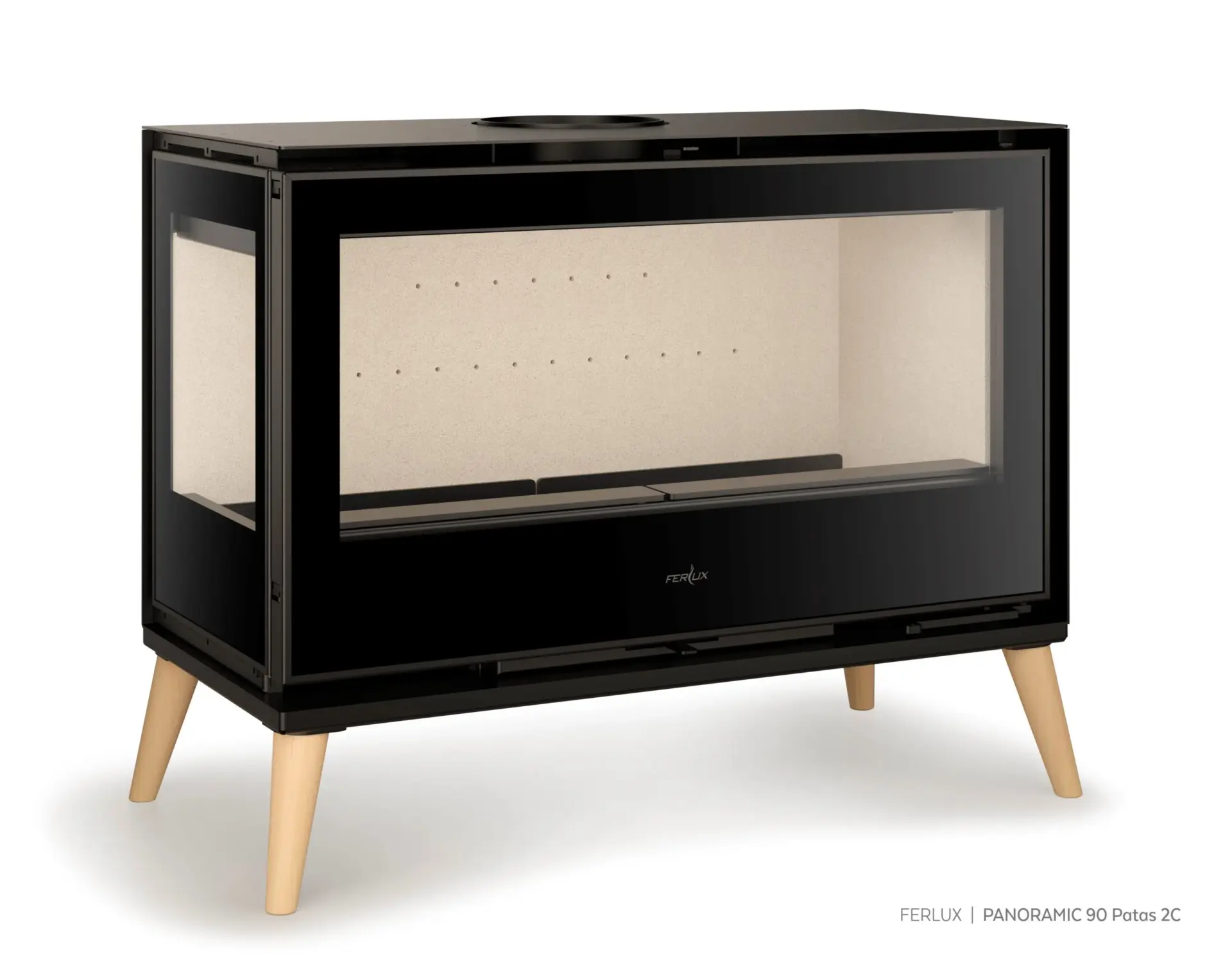 Deze mooie Ferlux panoramic 90 met zijn stoere houten pootjes is een blikvanger vol sfeer en warmte in uw woning .Het mooie brede vuurbeeld is vanaf drie zijden te zien en levert een uniek vlammenspel vol met sfeer in uw woning.En wat als deze mooie haard op pootjes ook nog eens warme lucht in uw kamer blaast,dan is de woning in no time op de gewenste temperatuur.Met zijn 11 Kw aan vermogen moet dit zeker geen probleem zijn.De Panoramic 90 heeft een Hoogwaardige vuurvaste keramische binnenkant.Primaire en secundaire luchtregeling en de ruimte ventilator is voorzien van 5 vermogen standen tot 120M3/U met afstandsbediening en veiligheids thermostaat. Ook is deze haard voorzien van een uitneembare aslade.